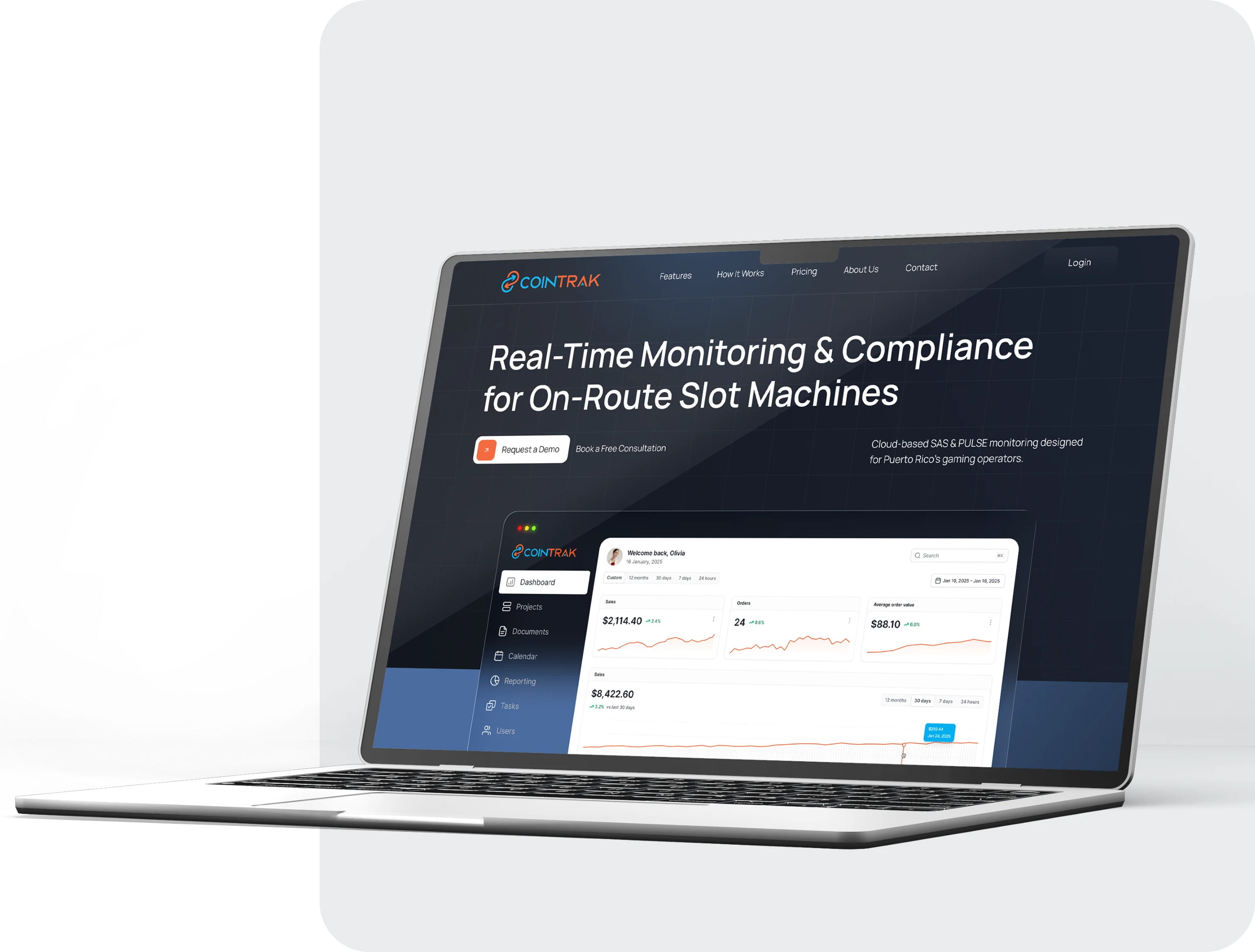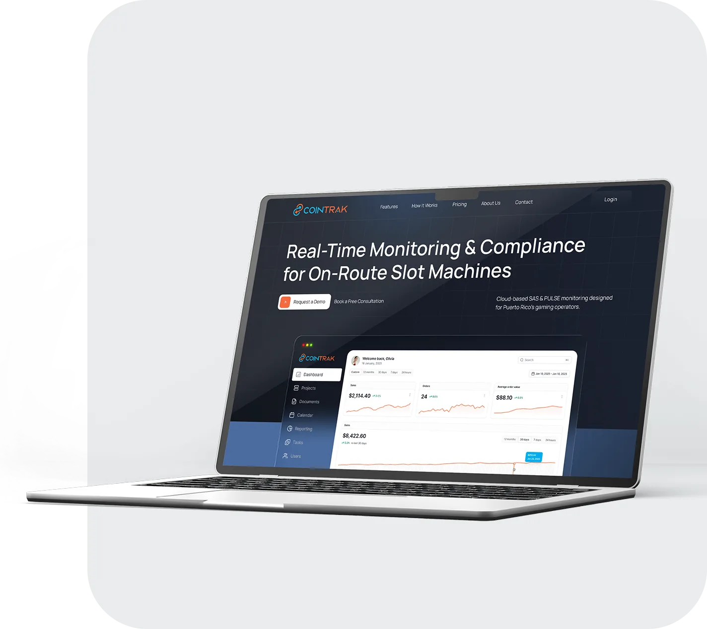 Cointrak is a cloud-based monitoring and accounting platform for On-route slot machines. We connect directly to SAS or Pulse compatible cabinets to capture every meter, event, and payout in real time, keeping operators compliant while maximizing revenue transparency.